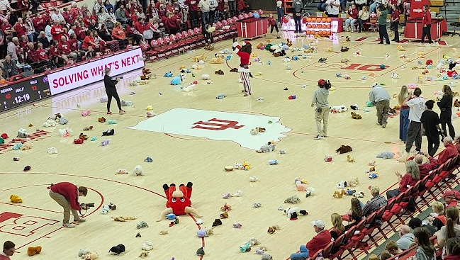 Today’s game was the annual Teddy Bear Toss, where fans brought new stuffed animals to donate to the Bloomington Boys and Girls Club. The halftime toss filled the floor of Assembly Hall, including a giant Bison thrown out by Hoosier the Bison.