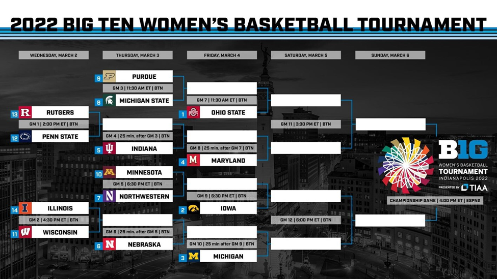The Big Ten Conference has announced the full bracket for the 29th Big Ten Women’s Basketball Tournament presented by TIAA that will take place March 2-6 at Gainbridge Fieldhouse in Indianapolis. Ohio State (22-5, 14-4 Big Ten) is the No. 1 seed for this year’s tournament after securing a share of the Big Ten Championship on Sunday with its 61-55 victory at Michigan State. The Buckeyes, who claimed the top seed by virtue of their head-to-head win over Iowa, earned their conference-record 17th Big Ten title (first since an outright crown in 2018) and have won six Big Ten Tournament championships (most recently in 2018).