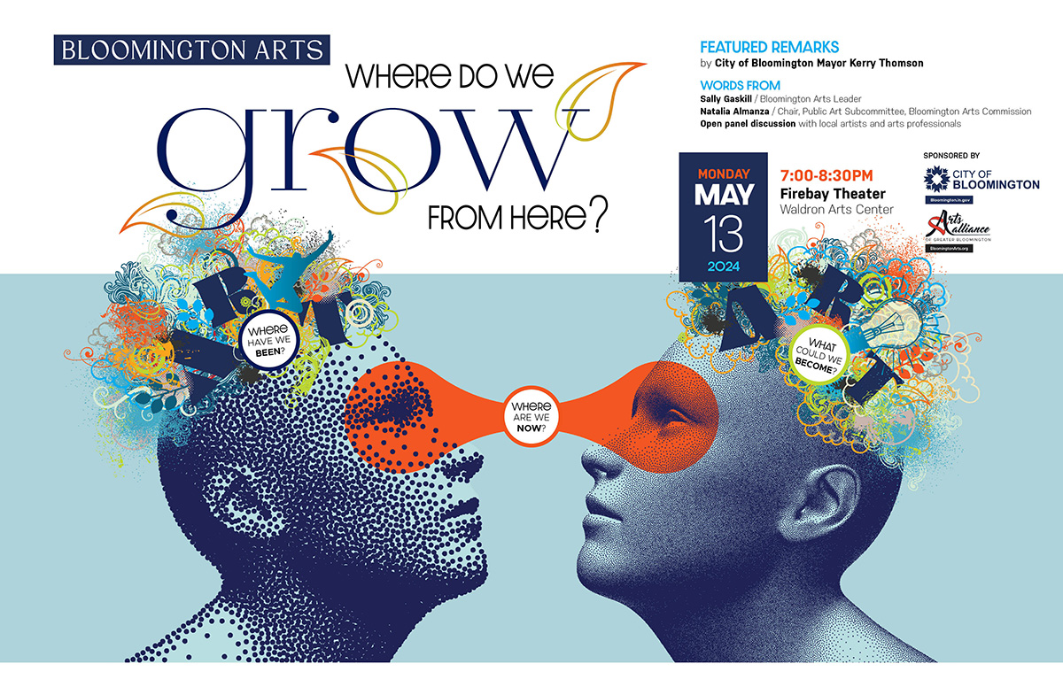 Find out at Bloomington Arts: Where Do We Grow From Here on Monday, May 13, 7pm, at the Waldron Arts Center hosted by Arts Alliance of Greater Bloomington along with the City of Bloomington. This event will address where we have been, and what we can aspire to as artists in our community. Special guest speakers have been invited including Mayor Kerry Thompson and other local arts advocates Sally Gaskill and Natalia Almanza. Following their featured remarks, the event will conclude in an open panel discussion in which we invite you to share thoughts, comments, and questions so come ready to engage with our esteemed panelists! We look forward to seeing you there!